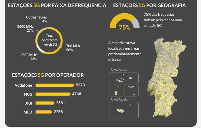 A entidade reguladora detalha que as estações base do 5G estão espalhadas por todos os 308 concelhos do país e por 2.318 freguesias, um número que corresponde a 75% das freguesias do país.