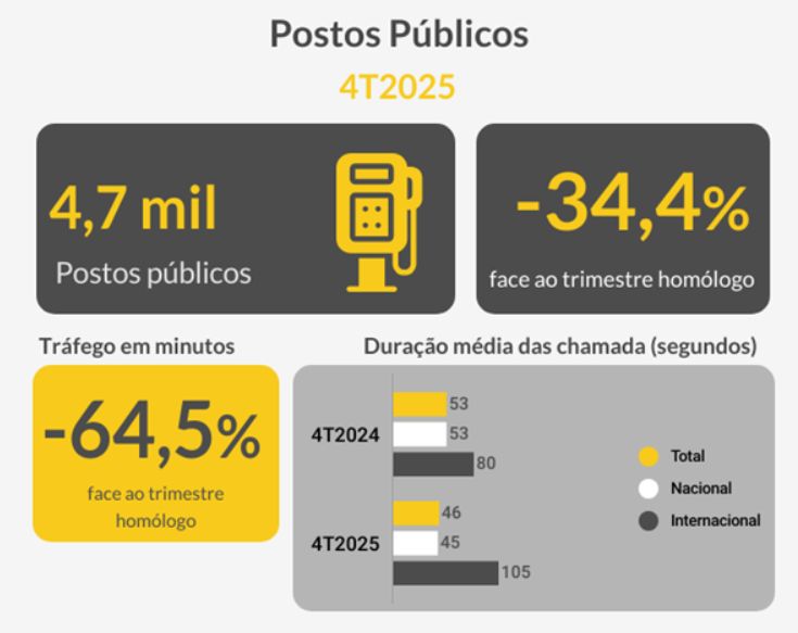 O número de postos públicos instalados no final de 2025 rondava os 4,7 mil, menos 34,4% do que no 4.º trimestre de 2024. O número de minutos falados nestes pontos de acesso público também caiu: 64,5% na comparação com igual período de 2024. Esta tendência de queda verifica-se sem alterações ao longo da última década. Desde então, o tráfego dos posts públicos caiu 94,9%.