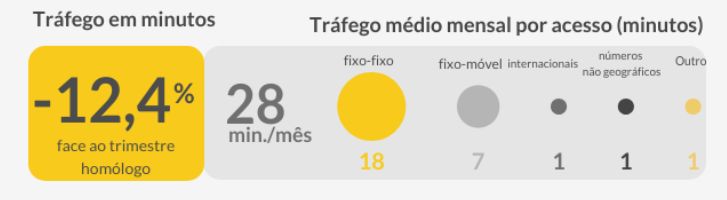 O volume de minutos originados na rede fixa caiu 12,4%. A redução do tráfego fixo-fixo ( em 15,5%) foi a que mais pesou nas contas, mas o número de minutos entre rede fixa e móvel também diminuiu (7%). Cada português falou, em média, 28 minutos ao telefone fixo no último trimestre do ano, menos quatro minutos por cada acesso do que um ano antes.