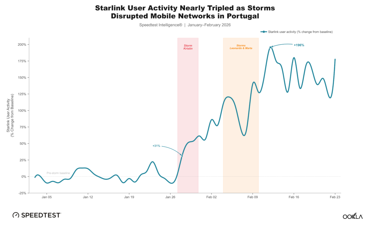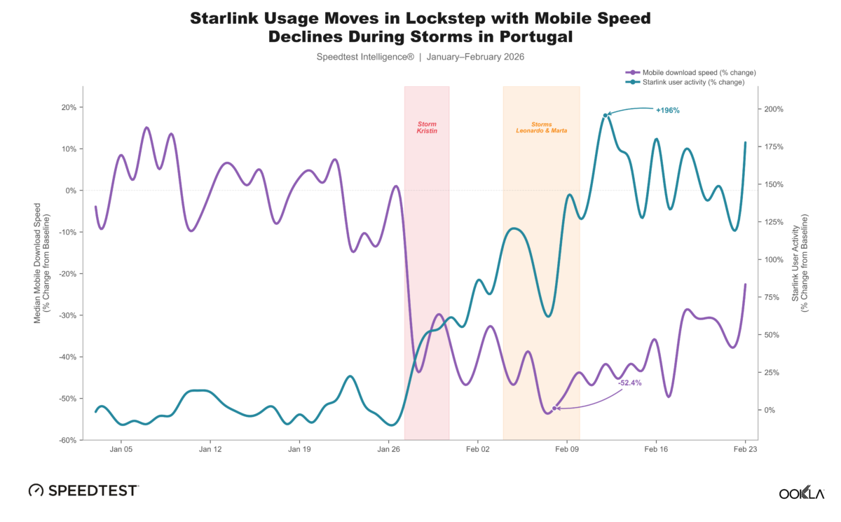 Entre 1 e 14 de fevereiro a atividade da Starlink em Portugal mais do que duplicou, ficando 118,4% acima da média habitual antes destes eventos. Esta utilização massiva também teve impacto na qualidade deste serviço.