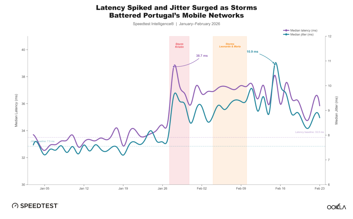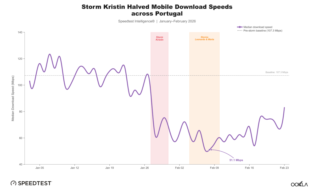Segundo esta análise, a velocidade média de download móvel em Portugal caiu até 52,4% em relação ao valor de referência anterior à tempestade, passando de 107,3 Mbps para apenas 51,1 Mbps no seu ponto mais baixo, atingido em 8 de fevereiro.